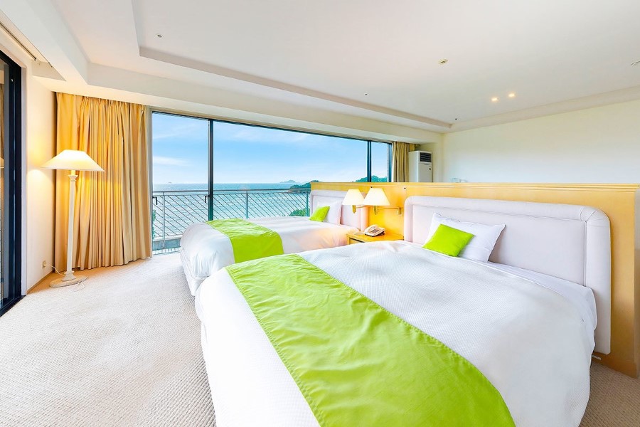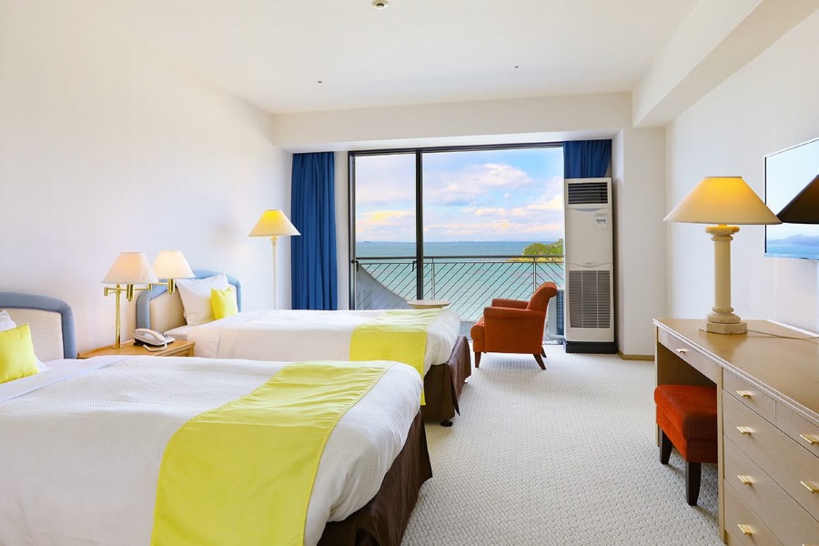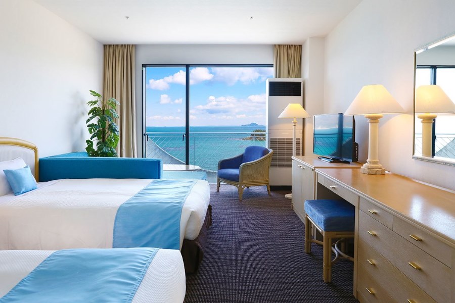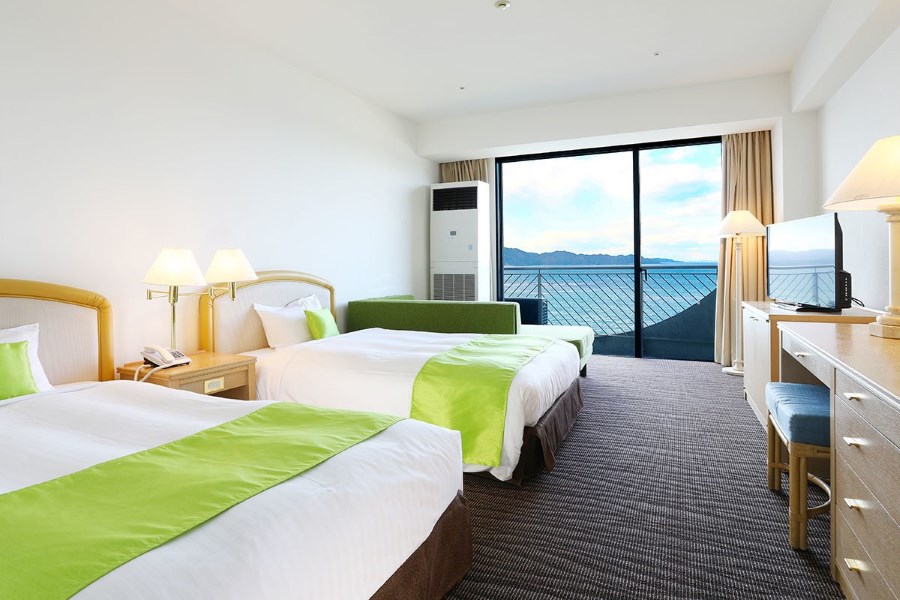 お部屋から海は見えますが、木々・建物などで少し海が見えづらいお部屋でございます。 3名様以上でのご利用の場合は3台目からエキストラベッドのご用意でございます。 バス・トイレはユニット形式です。