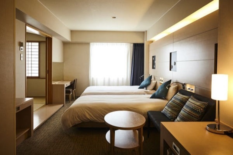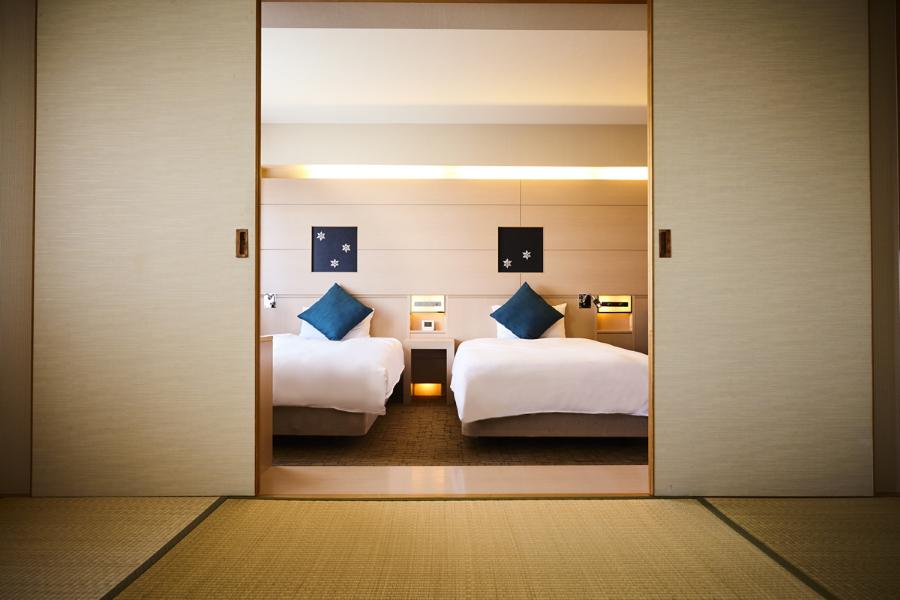 全室禁煙/ツインベッドと6畳の和洋室は45㎡で広々、最大5名様までご利用いただけ、大切なご家族でのご旅行を快適なものに。バス、トイレは独立式で洗面が2つあり、グループ・ご家族でのご利用に最適です。/※ファミリーツイン限定のミニバーのご用意は現在廃止となっております。予めご了承ください。