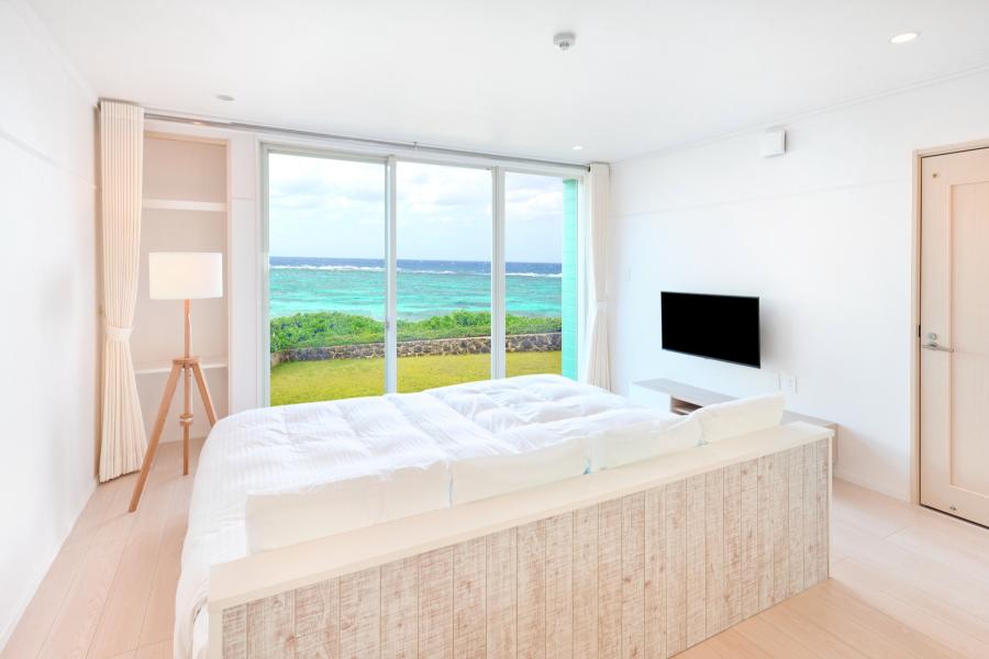 1Fにあるオーシャンビューハリウッドツインガーデンではベッドからヨロンブルーの海が一望できるほか、ジャグジー付きのガーデンがあります。1室3名様でのご宿泊希望の場合は1名様分はソファベッドでのご利用となります。(47平米)