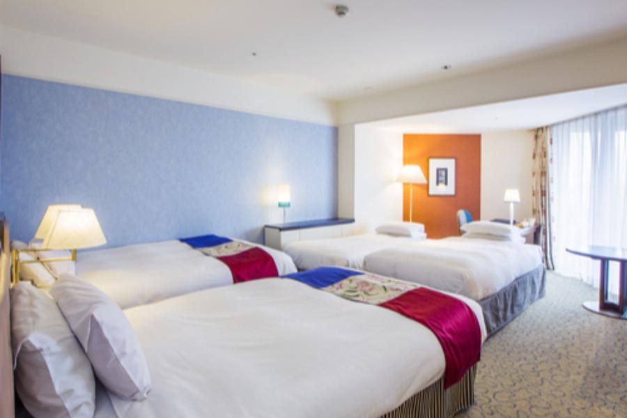 南館6~15階にある、黄色や青色を基調とした南仏リゾートの雰囲気漂うサウスリゾートフロアのフォースルームです。 全室、独立洗面台を配し、バルコニー付きの広々とした客室で、ゆったりとお寛ぎいただけます。 ※ツインルームにエキストラベッドを1台または2台追加してご用意いたします。