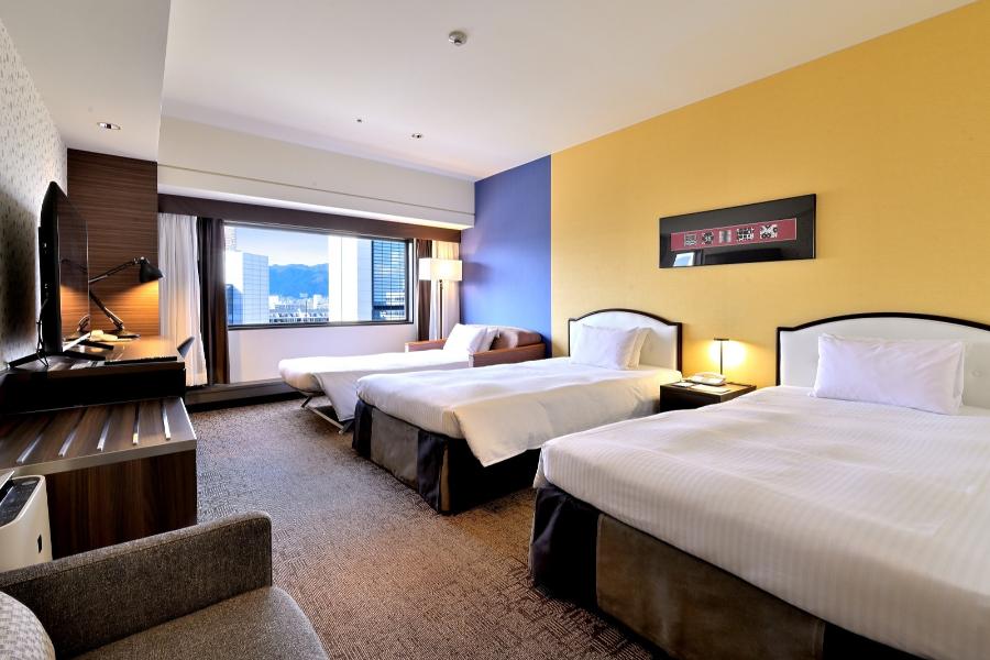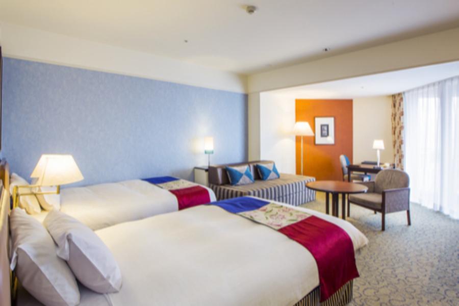 南館6~15階にある、黄色や青色を基調とした南仏リゾートの雰囲気漂うサウスリゾートフロアのトリプルルームです。 全室、独立洗面台を配し、バルコニー付きの広々とした客室で、ゆったりとお寛ぎいただけます。 ※ツインルームにエキストラベッドを1台追加してご用意いたします。